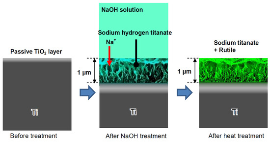 Formation of sodium titanate on the Ti surface subjected to NaOH immersion and following heat treatments. Reprinted with permission from Ref. [26]. Copyright 2010 MDPI.