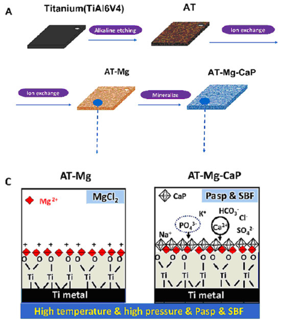 Thus, the alkaline titanates are most widely used as surface layers, primarily utilized in implants composed of titanium-based alloys [1]. A critical research area for such implants is surface modification to enhance adhesion to surrounding bone tissue [2,3]. Currently, hydroxyapatite (HA) coatings produced through plasma spraying are the most commonly employed method. Hydroxyapatite, a calcium phosphate compound, closely resembles the primary mineral, crystal, and chemical structure of cortical bone: Ca10(PO4)6(OH)2 [4]. However, these coatings are prone to residual stresses and cracking, leading to spalling and, ultimately, aseptic loosening in vivo due to macrophage activation and subsequent inflammatory responses [5,6,7,8,9]. By modifying the surface with alkaline titanate, the issue of coating spallation can be reduced [10,11,12,13,14,15,16]. Additionally, the incorporation of other elements such as calcium, magnesium, silver, and strontium into the titanate structure can enhance bioactivity and antibacterial properties [15,16,17].