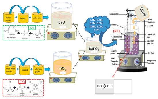 In Ref. [18], a chemical bath deposition method was utilized to fabricate barium titanate coatings. Barium acetate, Ba(CH3COO)2, and tetra-butyl titanate, Ti(C4H9O)4, served as precursor materials for this process. Acetic acid, ethylene glycol, and butanol were employed as the solvent and stabilizers. Two separate solutions, labeled A and B, were prepared as follows:
