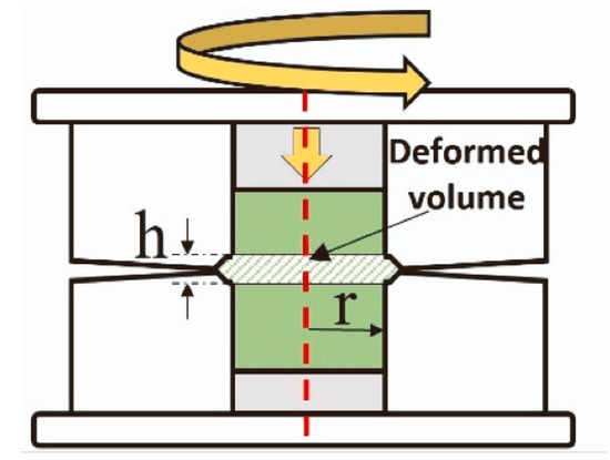 Scheme of high-pressure torsion. Red dotted line marks the common axis of the cylindrical parts of HPT machine. Reprinted with permission from Ref. [70]. Copyright 2024 Elsevier.