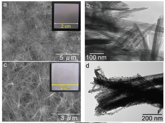 SEM images (a,c) and TEM images (b,d) of the sodium titanate nanofiber thin film [(a,b)] and the silver nanoparticle/silver titanate nanofiber thin film [(c,d)]. Insets within these images are photographs captured using a digital camera [44]. Reprinted with permission from Ref. [44] (open access). Copyright 2013 Hindawi.