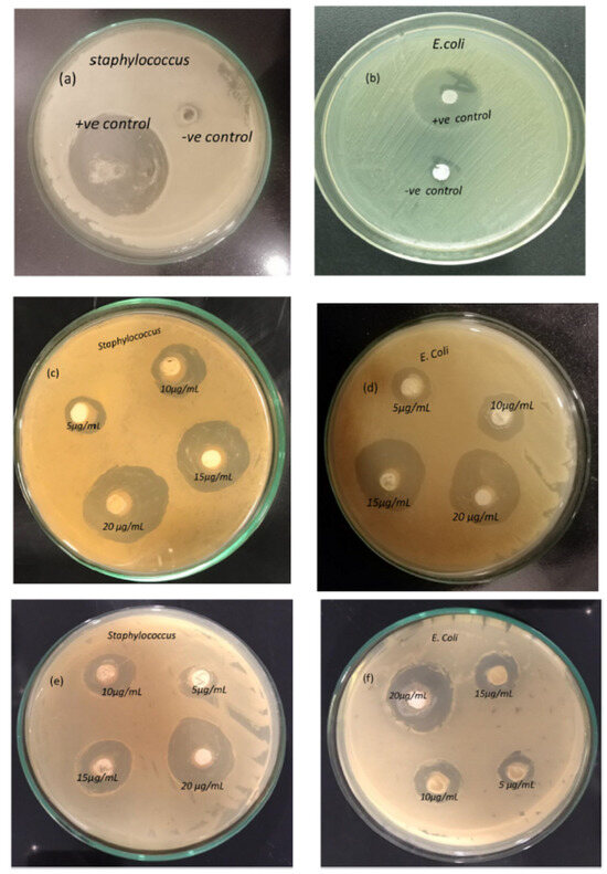 This indicates a substantial antibacterial effect of the coatings. Furthermore, the growth kinetics analysis demonstrated a dose-dependent response to the BaTiO3 coatings. The study revealed that higher concentrations of BaTiO3 (10–25 μg/mL) resulted in greater inhibition of bacterial growth, with 25 μg/mL exhibiting the most pronounced cytotoxic effect. Figure 12a–f highlight the distinct growth inhibition patterns for Staphylococcus and E. coli with increasing BaTiO3 concentrations. Notably, the highest zone of inhibition (~31 mm) was observed against Staphylococcus aureus, suggesting a more pronounced antibacterial effect against this specific bacterium. The findings demonstrate the potential of BaTiO3 coatings, produced using the CBD (chemical bath deposition) technique without hazardous solvents or reagents, for biomedical applications. This eco-friendly approach offers a promising avenue for developing antimicrobial materials in the healthcare sector.
