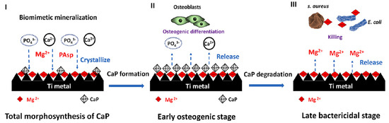 Schematic illustration of the hierarchical structure, composition, and formation of the sophisticated AT-Mg-CaP coating system (I). This system exhibits early, highly osteogenic effects triggered by the release of Ca2+ and PO43− (II) and subsequently facilitates bacterial eradication (of S. aureus and E. coli) through the release of Mg2+ in challenging infected scenarios (III). Reprinted with permission from Ref. [36]. Copyright 2023 Elsevier.