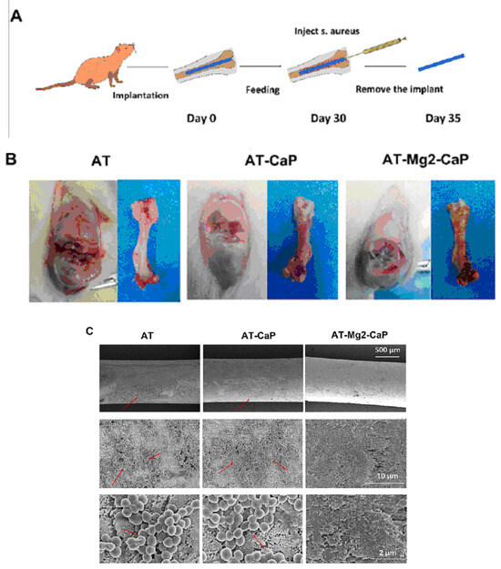 In vivo evaluation of the late-stage antimicrobial efficacy of rods using a rat osteomyelitis model. (A) Experimental procedure: A rat osteomyelitis model was established to assess the late-stage antimicrobial efficacy of the rods. (B) Macroscopic investigation: Macroscopic examination of the femur and knee joint revealed the extent of Staphylococcus aureus infection following surgery. (C) Scanning electron microscopy (SEM) morphology: SEM imaging of the S. aureus biofilms on titanium (AT), AT–calcium phosphate (AT-CaP), and AT–magnesium–calcium phosphate (AT-Mg2-CaP) implants revealed the morphology of the biofilms after S. aureus injection (n = 3 per group). Red arrows indicate S. aureus biofilms. (D) Energy dispersive X-ray spectroscopy (EDS) mapping: EDS mapping images of the AT-Mg2-CaP implant (taken from rat femurs) provided elemental composition information (Ti, O, Al, Ca, P, and Mg). (E) Bacterial colony formation: Bacterial colonies were cultivated from eluants collected from the different substrates (AT, AT-CaP, AT-Mg2-CaP) after 24 h. (F) Gram staining: Gram staining was performed on the femur osteoepiphysis with corresponding implants at 5 days post-S. aureus injection (scale bar: 250 μm, 50 μm). Red dashed circles highlight areas of neutrophil and lymphocyte infiltration along with bacteria. Reprinted with permission from Ref. [36]. Copyright 2023 Elsevier.