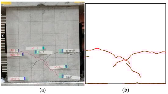 Figure 1. Remapping of sample image of the crack pattern taken at R = 1.0% (specimen S17N10FC50); (a) original; (b) remapped. - (Step 2) Track and remap the crack pattern to eliminate the influence of the initial hairline cracks caused by the dry shrinkage of concrete and the grid lines drawn on the surface, and save the remapped image (see Figure 1b) in the format of PNG. This PNG image will be referred to as the “input image” hereafter.