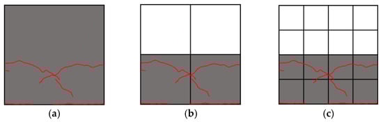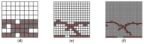 Figure 2. Example of dividing the target by boxes with the size ; (a) H; (b) H/2; (c) H/4; (d) H/8; (e) H/16; (f) H/32. - (Step 5) Count the number of boxes that cover all cracks and obtain the value of N(r) corresponding to the given r.