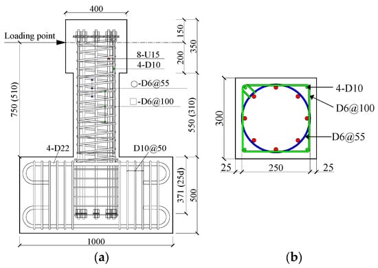 As illustrated in Figure 5, the longitudinal rebars consisted of eight or twelve SBPDN bars (U15) circularly arranged along the perimeter of the core with a diameter of 250 mm. To prevent the premature slippage of SBPDN rebars, both ends of each SBPDN rebar were anchored to a circular steel ring with thickness of 9 mm by two nuts. The transverse steels were composed of a spiral with spacing of 55 mm and square hoops with spacing of 100 mm. The D6 deformed spiral and square hoops were placed to confine the core concrete and to prevent premature spalling of the concrete shell, respectively. The square hoops were supported by four corner-placed D10 deformed bars, which were cut off at the section 10 mm away from the top surface of the foundation beam so that the D10 rebars did not directly resist axial stress induced by axial compression and moment.