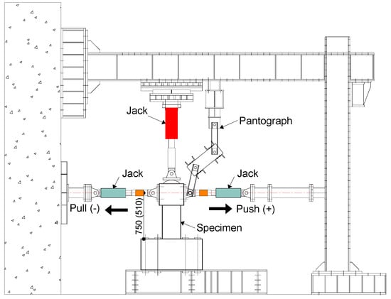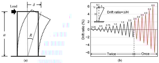 Figure 6 illustrates the loading apparatus. As shown in Figure 6, the axial compression was applied using a 1000 kN capacity hydraulic jack before applying the cyclic lateral loading via two 300 kN capacity jacks. The reversed cyclic lateral loading was controlled by the drift ratio (R), which is the ratio of the tip lateral displacement (δ) to the shear span (a) of the column and is defined in Figure 7a. The loading program, which has been generally adopted in Japan, is displayed in Figure 7b. As is obvious from Figure 7b, the lateral load was applied for two complete cycles at the transient drift ratios of 0.25%, 0.5%, 0.75%, 1.0%, 1.5%, and 2.0%. Only one complete cycle was performed at the drift ratio larger than 2.5% up to 6.0%. The testing was terminated either when the column could no longer sustain axial gravity or when the drift ratio reached 6.0%, which corresponded to the stroke limitation of the jacks applying the lateral load.