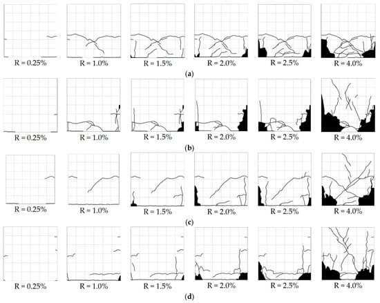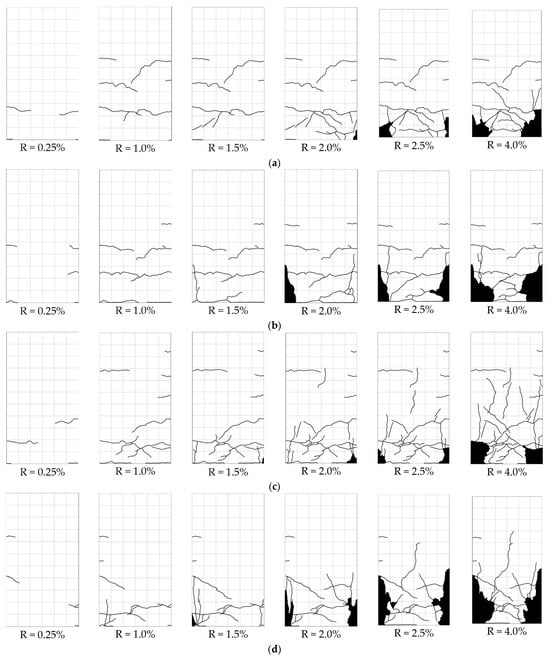 Figure 8 and Figure 9 show the propagation of the remapped crack patterns on the surface along with the drift ratio for the specimens with a/D ratios of 1.7 and of 2.5, respectively. While crack propagation was photographed and remapped at each transient drift ratio shown in Figure 6, only the crack patterns observed at transient drift ratios of 0.25%, 1.0%, 1.5%, 2.0%, 2.5%, and 4.0% are displayed because they provide sufficient information about the propagation of crack patterns for the tested columns. The black areas near the column feet shown in Figure 8 and Figure 9 represent the area of spalled-off or crushed concrete.