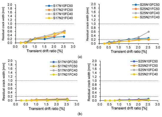 The measured residual crack widths shown in Figure 12 express the average of the crack widths measured in both push and pull directions. The crack widths were measured using a crack width ruler whose range varied from 0.03 mm to 2.5 mm. The two horizontal dotted lines superimposed in Figure 12 represent the crack widths defining the “operational” state and the lower “repairable” state prescribed in JBDPA guidelines, respectively. It is noted that the measured crack widths at the drift ratio of 2.5% are displayed only as reference because the crack widths measured at that drift ratio became unreliable due to the severe crushing of the cover concrete.