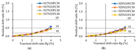 Measured residual drift ratios: (a) specimens with a/D = 1.7; (b) specimens with a/D = 2.5.