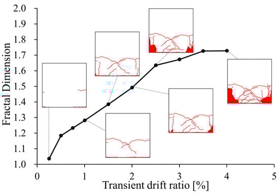 Figure 14 shows an example of the propagation of crack patterns and corresponding FDs calculated using the box-counting algorithm for specimen S17N10FC50. It is obvious from Figure 14 that the derived FD increases as the transient drift ratio increases and cracks propagate. The FD at the transient drift ratio of 0.25% is less than 1.1 and beyond 1.1 from a 0.5% drift ratio and upwards. Because the maximum residual crack width and residual drift ratio measured at the 0.5% drift ratio are less than 0.1mm and 0.06% (Figure 12 and Figure 13), respectively, implying that no repairing is needed [16,17], it can be recommended that only the FDs corresponding to transient drift ratios larger than 0.5% are meaningful from the perspective of post-earthquake damage assessment.
