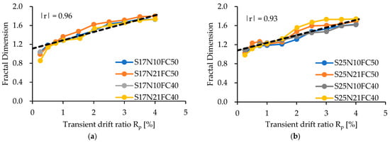 Variation in the derived FD is significantly observed at lower drift ratios than 0.5%, and the ascending slope of FDs along with drift ratios becomes gentle after the drift ratio of 0.5%. From the 0.5% drift ratio and upwards, the derived FDs exhibit very strong correlations with transient drift ratios. The black dashed straight lines superimposed in Figure 15 represent the best-fitting straight lines obtained by conducting linear regression analysis on the test results derived at 0.5% and larger drift ratios. The correlation coefficients of these two regression straight lines are as high as 0.96 and 0.93, indicating that the fractal dimension is a very useful and reliable indicator to quantify propagation and pattern changes in surface cracks for resilient concrete columns.
