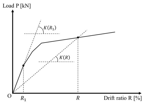 Definitions of initial stiffness and secant stiffness at different loads and drift ratios.