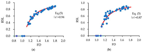 Relative stiffness loss (RSL) versus fractal dimension relationships: (a) specimens with a/D = 1.7; (b) specimens with a/D = 2.5.