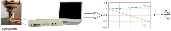 Test setup for the strain gauge measurements and calculation of the Poisson’s ratio (ν): Exx—strain in the transverse direction; Eyy—strain in the longitudinal direction.