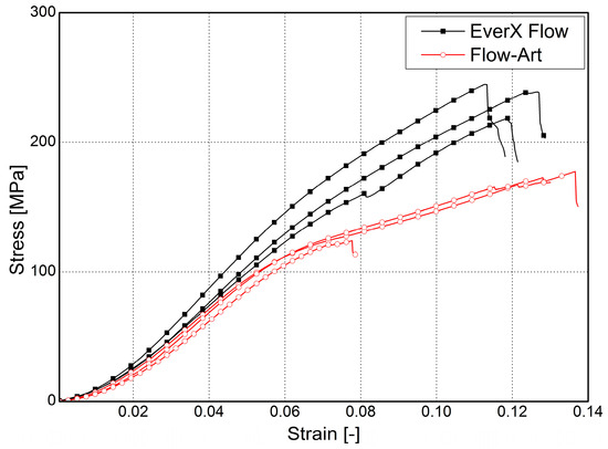 The values of the Poisson’s ratio determined using the two strain measurement methods are similar to each other (Table 1). The repeatability of the measurements for both methods was good, as shown by the low standard deviation values of 0.04 and 0.05 for DIC and 0.01 for the strain gauge method. For EverX Flow, the difference in the Poisson’s ratio values for the two methods is 0.01, while for Flow-Art it is 0.02, and it is not statistically significant different (p > 0.05).