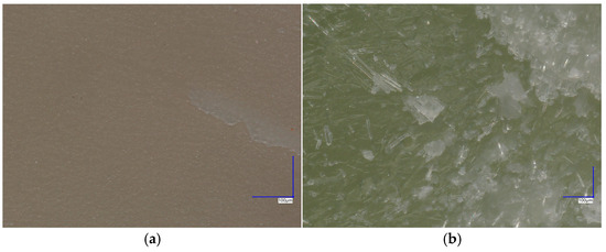 Structure of dental composite materials after compression test: (a) Flow-Art; (b) EverX Flow. The images were taken using a microscope KEYENCE VHX-7000N (Keyence International, Mechelen, Belgium).
