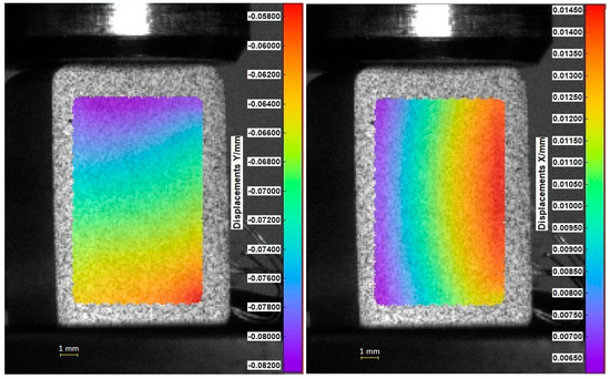 As a complement to the DIC experimental results represented as contour displacement distributions, the finite element modeling (FEM) of the displacement fields of the specimen was performed. The modeling of the calculation schemes was carried out using the commercial finite element software package ANSYS 2022R2 (Ansys, Inc., Canonsburg, PA, USA). The model integrates the geometry of the test specimens used in the experiment. According to the loading method of experimental test, two steel blocks were placed, respectively, at the top and the bottom of the specimen. The interactions between the specimen and plates were implemented by the classic Coulomb friction behavior. The friction coefficients considered in the simulations were 0.3. All freedoms of the bottom plate were constrained. The compressive static load (1 kN) was applied to the steel plate above the prism specimen. To define the linear elastic material response range of the material model, input material properties, including the modulus of elasticity and Poisson’s ratio, obtained from uniaxial compression experiments performed by the authors within this study were introduced. All the specimens in this study were modeled using an eight-node solid element (solid 185), and the average mesh size was 0.5 mm. Additionally, after the correlation process in the DIC system, the HDF5 (Hierarchical Data Format) file and ASCII format were used to export all data steps from Istra 4D. These data were implemented in Ansys 2022R2 software to obtain displacement maps using displacement values registered by the DIC technique. This approach allows for the comparison of results obtained using FEM (defining material properties or using displacement DIC data) and the DIC method and also indicates the difference between these methods.