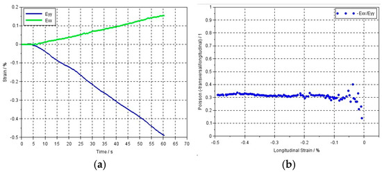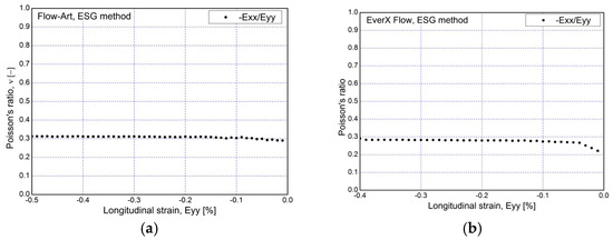 Example of Poisson’s ratio vs. longitudinal strain obtained from ESG method: (a) Flow-Art; (b) EverX Flow.