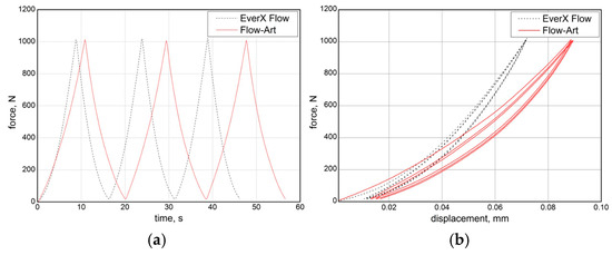 Strain measurement using the electric strain gauge method was performed when the specimen was compressed to a load of 1 kN. In order to check the repeatability of the measured deformations in the elastic range, which take on small values, the measurement was carried out in three load–unload cycles. The recorded curves are shown in Figure 7. The load–unload curves indicate a faster achievement of the intended load level of 1000 N, also indicating a higher stiffness of the EverX Flow compared to Flow-Art. Recording deformations with strain gauges made it possible to calculate the Poisson’s ratio for the tested materials. The relationship of the ratio and strain in the longitudinal direction is shown in Figure 8.