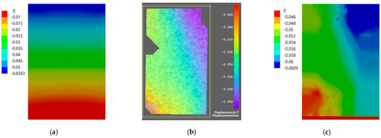 Displacement maps for longitudinal compression for EverX Flow dental material: (a) simulated using FEM; (b) measured using DIC; (c) simulated using FEM with data from DIC.