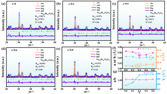 x = 0.4. All samples correspond to the primary NBT phase, with no secondary phases detected.