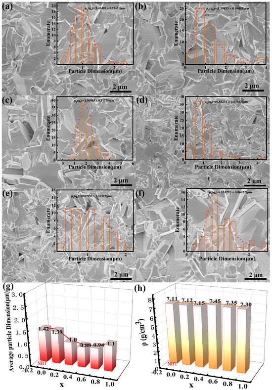 Figure 1a shows the X-ray diffraction (XRD) patterns of NBLMTC-x piezoelectric ceramics sintered at 1100 °C. All ceramics exhibit a layered perovskite oxide structure (NBT, PDF 89-4732) with no secondary phase impurities. The principal diffraction peaks of all samples align with the main phase of NBT ceramics, indicating the successful incorporation of Ce into the NBT attice.