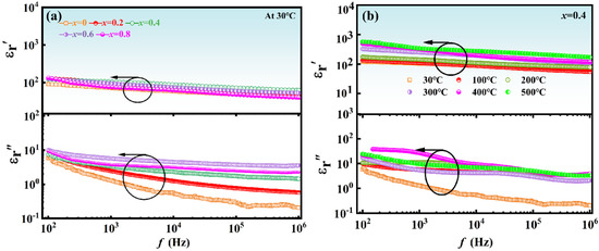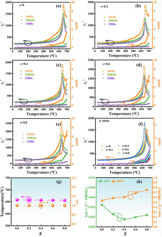 x ceramics at 25 °C and 500 °C. At 25 °C, tan δ remains low (<0.2%), and it is still below 0.8% at 500 °C. Therefore, Ce-doped samples exhibit promising potential for use in high-temperature applications.