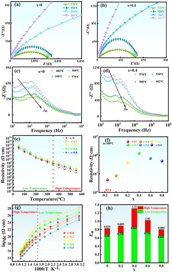Figure 8e illustrates the DC resistivity of NBLMTC-x ceramics changes with temperature. The resistivity of these ceramics decreases progressively with increasing temperature, with the sample having x = 0.4 exhibiting the highest resistivity of 1.0 × 10