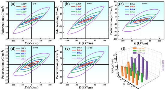 E hysteresis loops of NBLMTC-x ceramics at various electric fields were measured at 1 Hz and room temperature, as shown in