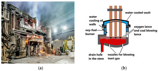 Reaction (1) takes place during simultaneous injection of coal and oxygen by means of lances. Reactions (2) and (3) are partial reduction reactions of FeO contained in the slag by means of injected coal particles, where reaction (2) takes place at the slag–gas bubble boundary surrounding the solid coal particle and reaction (3) takes place at the interface between the surface of a solid carbon particle and the surrounding gas bubble. Gaseous CO is also formed in the arc furnace as a result of reaction (4)—reduction of FeO in slag from coal dissolved in a metal bath [8,9].