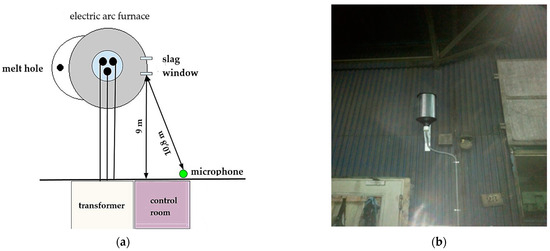 (a) The position of the microphone relative to the electric arc furnace, (b) the position of the microphone on the control room wall.