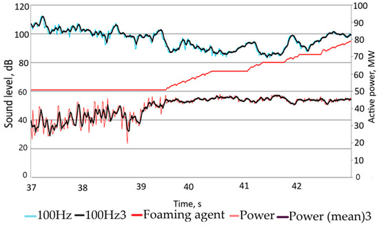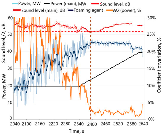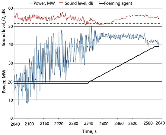 The results of the study of active power consumption and the course of feeding the foaming to the furnace are shown in Figure 4 (for practical reasons, the noise level was divided by 2; in this situation, the reference noise level was, of course, 51.5 dB). The graph also schematically shows the process of feeding coal (foaming agent) to the furnace’s working space.