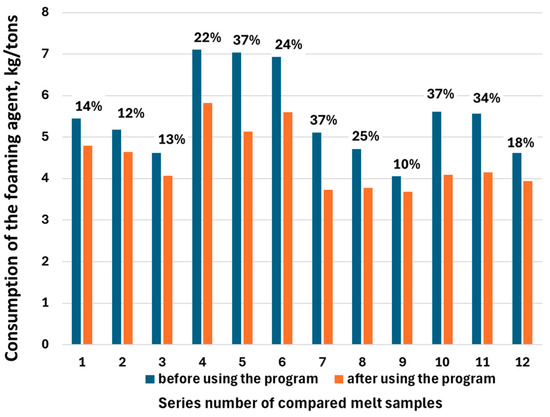 Comparison of foaming agent consumption during melts running with the new program determining the moment of starting foaming agent feeding and melts running with the old program. The percentage values indicate the difference in the value of foaming agent consumption before and after using the new program.