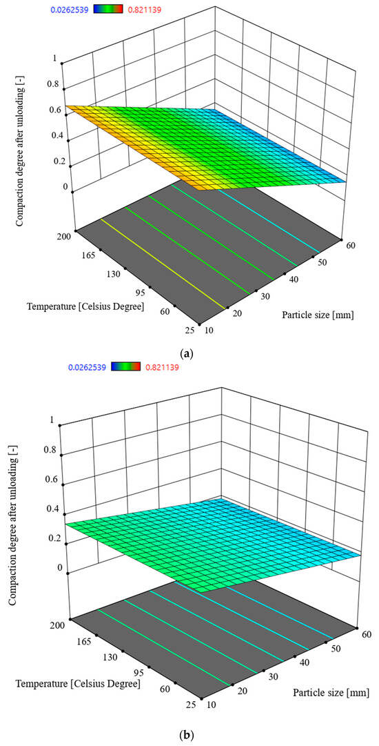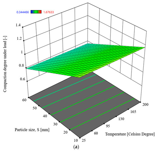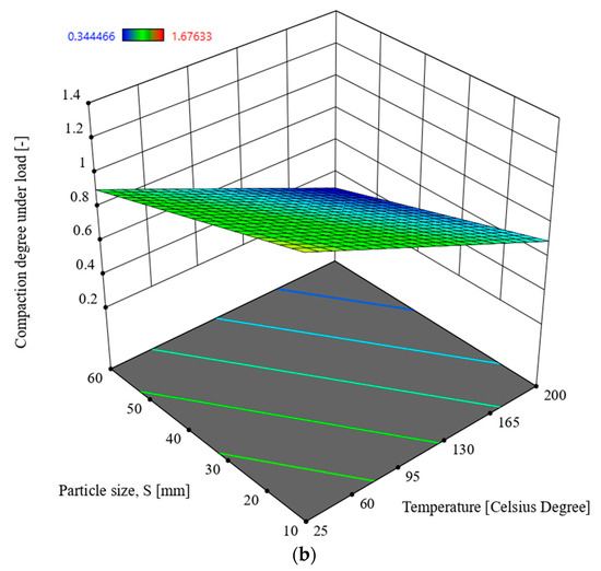 Table 5 presents a hierarchical arrangement of the factors and their relationships based on the statistical model values (F-statistics). The table includes the following parameters: S—particle size [mm], T—temperature [°C], M—moisture content [%]. These factors are analysed in relation to the responses being the densification degree under load x1 [-] and the densification degree after unloading x2 [-], which represent the densification characteristics observed in the experiment.