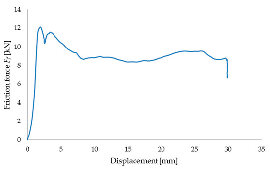 An example of the characteristic curve showing the variation of the friction force as a function of displacement for a densification temperature of T = 25 °C and moisture content M = 10%.
