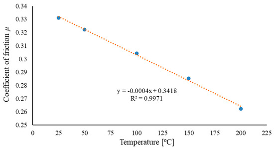 Figure 10 shows the average values of the friction coefficient as a function of temperature. As the temperature increases, there is a slight decrease in the friction coefficient from μ = 0.33 at T = 25 °C to approximately μ = 0.26 at T = 200 °C.