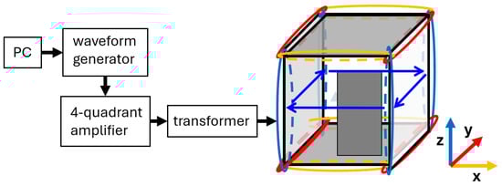 Schematic illustration of the experiment’s layout established to degauss the MSR. The identically colored coils on the edges are interconnected in a series so that the magnetic field induces a complete magnetic loop inside the shielding material around the inner volume, as indicated by the blue arrows for the blue coils.