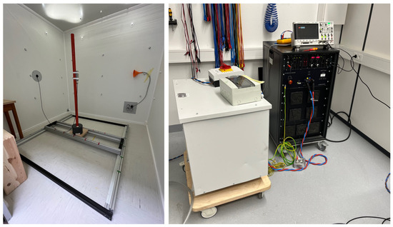 During the measurement campaign, the shielding factor (SF) of the MSR was measured along three spatial directions to aid in interpreting the residual field maps. A set of three Helmholtz-like coil systems, permanently installed outside the MSR, were used to apply the excitation field. The same apparatus, as shown in Figure 1, was used to drive the coils, except for the transformer. Additionally, an automated switch controlled by the PC was incorporated to toggle between the Helmholtz coils in different directions. This setup enabled automated data acquisition at night, which is crucial as low-frequency measurements require extended measurement times.