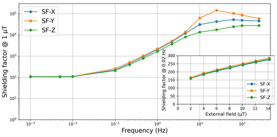 Measured shielding factor (SF) curves for the three axes of the two-layer MSR with a 1µT effective excitation field strength. In the inset: dependence of the SF at 0.02 Hz on the amplitude of the excitation field.