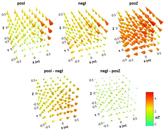 Field distributions common to all three 3D scans contributing to the average, such as the field from the A4 screws at the front right corner and the common residual field, are not present when calculating the differences to the average map. The 3D field map, ave-negI, shows that negI is very close to the average. The only non-statistically distributed field appears near the door, being just 1 nT larger in the direction of the door hinge. The other two differences, ave-posI and ave-posZ, display field vectors in a single direction, with amplitude increasing towards the door as expected for an environmental field change after degaussing.