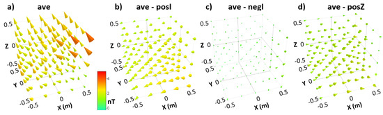 We hypothesize that the difference in the environmental field at the MSR site for the different degaussing times for the different scans caused the largest difference in the measured residual field. As illustrated in Figure A1 of Appendix A, there is a correlation between the environmental field and repeated measurements at the center of the MSR. However, since we did not record the field outside the MSR with the reference fluxgate after degaussing, we cannot confirm that the average field value of the maps (b), (c) and (d) of Figure 5 listed in Table 1b correlate with the change in the environmental field from the time of degaussing to when the 3D scan of the inside field was conducted.