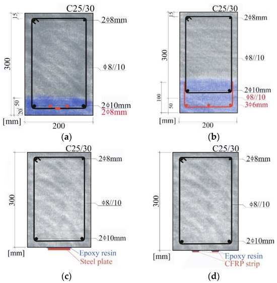 The following four strengthening methods, illustrated in Figure 1, are considered and designed to provide a flexural strength increase of 40% (as close to as possible, as detailed ahead); the different solutions were designed following well-established calculation methodologies (e.g., those recommended in fib Bulletin 90 [33]), assuming that plane sections remain plane after bending and perfect bond between the concrete substrate and the strengthening materials: