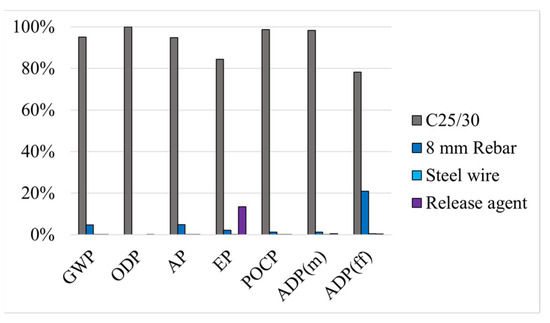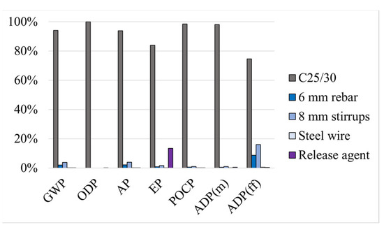 The following environmental sources are considered: (i) for concrete, an EPD for fresh concrete with the reference S-P-05207 [51]; (ii) for steel rebars, an EPD for steel reinforcing rebars with the reference S-P-05173 [52], (iii) for the steel wire, an EPD for hot rolled steel wire in a coil with the reference S-P-04744 [53]; and (iv) for the anti-corrosion coating, the EPD for Jomatastic 90 with the reference NEPD-2396-1134-EN [54]. With this information, it is then possible to calculate, for each of the solutions, the environmental impacts in the A1–A3 stage, considering the environmental factors referred to in Table 2; the results obtained are presented in Table 3.