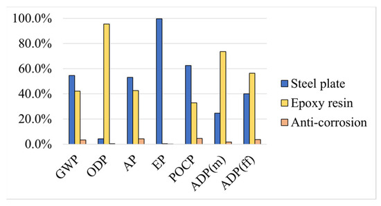 Firstly, the results are presented with the A1–A3 stages separated from the A5 stage; hence, in the first approach, the embodied environmental impacts in these stages are highlighted, followed by the impacts in the A5 stage, in which the environmental impacts result from a scenario that might vary with changes in the application procedures relative to those described previously.