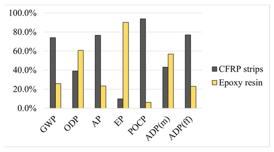 This study was developed considering a specific (but typical) strengthening case study, comparing four different solutions often used in engineering practice. The extension of the findings to other strengthening interventions (e.g., confinement of reinforced concrete columns) should be investigated in future studies. Moreover, it should be highlighted that only the product stage (A1–A3) was considered, as most environmental impacts are concentrated in this stage [56]. Considering the whole life cycle will add value to the decision-making, especially if maintenance operations prove to be relevant for one or more solutions. Thus, future works on the durability of the strengthening solutions (namely the ones involving bonding operations and the use of FRP systems) and their impact on maintenance and life cycle assessment will add valuable insights and inform future strengthening decisions.