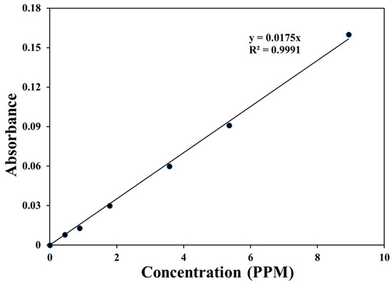 Standard H2O2 solutions were made by placing 5 mL of the titanium reagent in each of the 6 vials, and then, aliquots of the standard H2O2 solutions were added. The total volume was adjusted to 15 mL with nano-pure water. The absorbance of each sample solution, blank and standard, were determined at 410 nm with 100 cary UV–Vis spectrophotometer. An absorbance of 0.00 was measured for the blank reagent. After that, a standard calibration curve was plotted from the obtained absorbance values of the standard H2O2 solutions is shown in Figure 1. This standard curve should go through the origin.