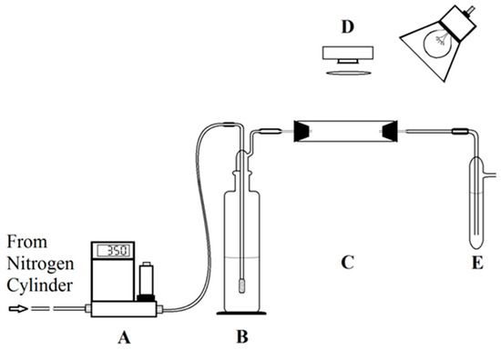 A schematic diagram of the experimental apparatus setup utilized to expose and track the thin films is shown in Figure 2. For the source of nitrogen as the carrier gas, a nitrogen cylinder was used, which was from (Airgas, Ultrahigh Purity, Radnor, PA, USA). The regulator back pressure was placed at 20 psi, and for all experiments, an Omega FMA 5500 mass flow controller (A) was used, where the flow was set to 350 standard cubic centimeters per minute (sccm). Then, a flow of nitrogen gas was run through a 250 mL bubbler (B) containing a peroxide solution. The gas was passed into the solution by using a sintered glass head, which spread the gas through the solution to ensure a steady absorption of the peroxide vapor. The hydrogen peroxide solution concentration in the bubbler defines the concentration of the gas phase, which is directly calculated as described below. After that, the peroxide-enriched gas was passed into a custom PTFE (Polytetrafluoroethylene) hollow cylinder cell containing the thin film, either a film on a silicon pad or a test strip (C). The PTFE cell contained a piece of white plastic paper attached to its outer end to generate a white background. A 20 W incandescent light was placed over the PTFE cell to deliver identical lighting for the slide along with images of the sample filmed with a Logitech Pro 9000 USB camera throughout introduction to the peroxide vapor (D). There was a Leiz Wetzlar BG 12 blue bandpass filter between the camera and the cell that separated the wavelengths of light between 300 and 500 nm.
