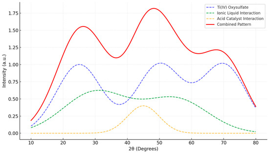 An X-ray diffraction (XRD) analysis was conducted to study the structural interactions between Ti(IV) oxysulfate, ionic liquids, and an acid catalyst, revealing a combination of crystalline and amorphous features that highlight the hybrid nature of the material see Figure 5. The sharp and well-defined peaks associated with Ti(IV) oxysulfate confirm its crystalline structure, indicating the retention of ordered domains within the material. In contrast, the ionic liquid introduces a degree of structural disorder, as evidenced by the broadening of certain peaks. This broadening suggests partial amorphization or a disruption of the crystalline lattice, likely due to the incorporation of ionic liquid components into the material.